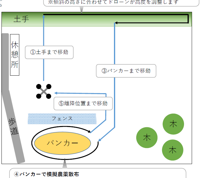 今回の実証実験では、ユースケースをキーパーの方々が定常作業を行われている傍らでドローンが飛行、散布するというシナリオで指定箇所へ自律飛行し指定高度まで降下、その後指定ポイントへの薬剤散布を行うという流れで実施いたしました。(図参照)