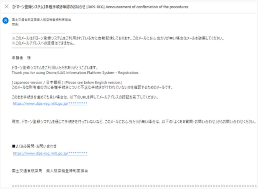 新規登録の申請について、航空局の確認が終わると、「手数料納付番号」と「納付用URL」がメールで届くよ。