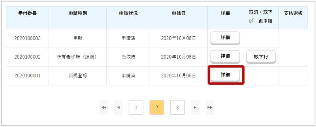 ※「支払選択」ボタンが押す事のできない申請については、既にお支払い済みか、まだお支払いの準備ができておりません。(お支払いの準備が整うとアカウントに登録されているメールアドレスに通知が届きます)