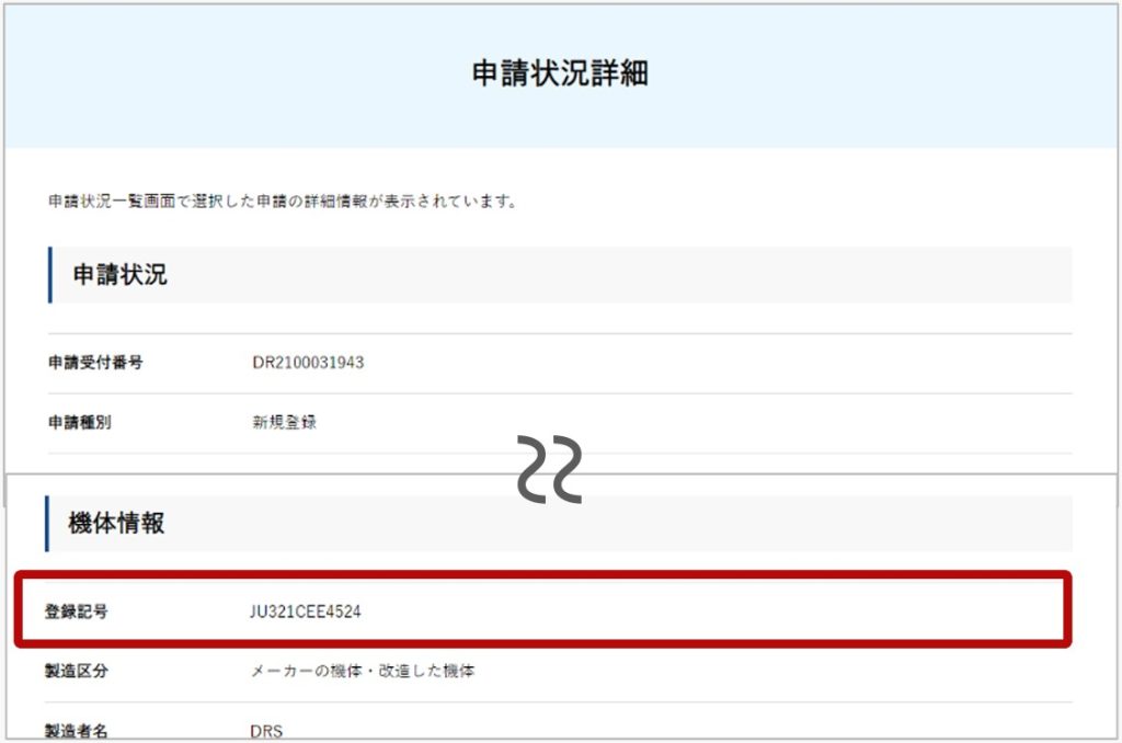 申請内容の詳細ページが表示されるので、登録情報を確認してみよう。登録記号は機体情報の中の登録記号の項目に記載されているよ。