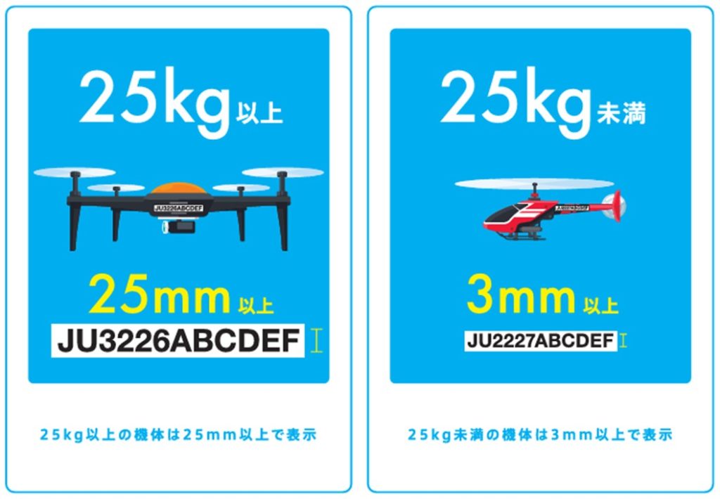 無人航空機を飛行させる場合は、登録記号をマジックやシールなどで機体に表示しよう。25kg以上の機体は高さ25mm以上、25kg未満の機体は高さ3mm以上の文字で表示が必要だよ。